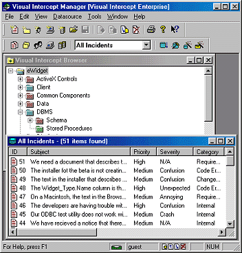 The latest version of Visual Intercept includes Visual Intercept Studio, an add-in that lets developers access incident data directly from within the Visual Studio IDEs. Now users of Visual Basic, Visual C++, Visual InterDev, and Visual J++ can submit incidents and get updates on their assignments without ever leaving their IDE.